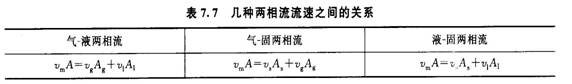 由于兩相流動(dòng)中相間存在相對速度,所以除了以混合流體的平均速度Vm描述外,還必須采用分相流速(氣相分相流速Vg、固相分相流速Vs、液相分相流速V1)來(lái)表示。幾種流速之間存在如表7.7的關(guān)系。