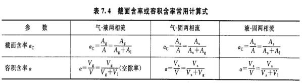 (3)截面含率或容積含率α為分相流體在管道某一截面上所占截面積(氣相截面Ag 固相截面As、液相截面A1)與兩相混合物所占總截面積A之比,或分相流體在某一長(cháng)度L的管段中所占容積(氣相容積Vg,固相容積Vs、液相容積V1)與兩相混合物總容積V=LA之比,常用計算式見(jiàn)表7.4。