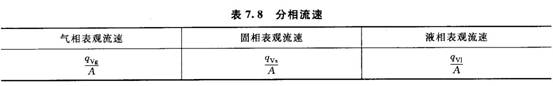 為了便于工程應用,分相流速也常采用表觀(guān)流速概念進(jìn)行折算,即以分相流量除以管道總截面的比值來(lái)表示該相的分相流速。其物理意義是當管道中流體全是該分相流體時(shí)所具有的流速。見(jiàn)表7.8。