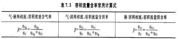 (2)容積流量含率 β為分相容積流量(氣相容積流量qVg、固相容積流量qvs、液相容積流量qV1)與兩相混合物總容積流量qv之比,常用計算式見(jiàn)表7.3。