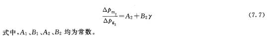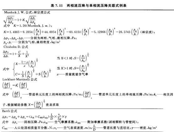 壓力降也是兩相流動(dòng)中的基本參數之一;旌衔锏膬上嗔鲏毫郸pT與氣相、液相、固相分相壓力降Δpg、Δpl、Δps之間已建立了很多理論的、實(shí)驗的和半經(jīng)驗的關(guān)聯(lián)式,為兩相流量和分相流量的計算提供了依據。典型關(guān)聯(lián)式列舉見(jiàn)表7.11。