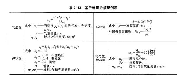 (4)基于流型的模型(model based on flow paffern)對于各類(lèi)兩相流中的各種流型, 都建立了一些半經(jīng)驗公式,可供工程應用。列舉見(jiàn)表7.12。