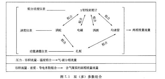 (2)雙正(多)參數組合測量 應用兩種或多種儀表進(jìn)行雙(多)參數組合測量得到兩相 (多相)流量的測量方法,在實(shí)際應用中已經(jīng)出現了多種組合的成功應用如圖7.1所示。