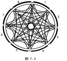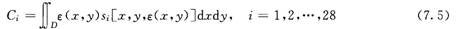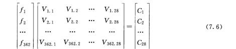 電容層析成像系統目前用得較多的圖像重建算法,是在一定假設條件下以基本的反投影算法為基礎,經(jīng)門(mén)限濾波等處理改進(jìn)的簡(jiǎn)便反投影算法。算法的基本思路是很簡(jiǎn)捷的。先在管截面內畫(huà)出所有28個(gè)測量電容正靈敏區的邊界線(xiàn),這些邊界線(xiàn)相呈交截,在管截面內形成362個(gè)大小不一的網(wǎng)格,如圖7.3所示。這些網(wǎng)格稱(chēng)為圖像像素。每個(gè)像素i與28個(gè)正靈敏區的關(guān)系可用一個(gè)28維的關(guān)聯(lián)向量Vi來(lái)表示。將此關(guān)聯(lián)相量乘以由28個(gè)測量值構成的向量[Cl C2…C28 ]T,則相當于將有關(guān)測量值疊加(反投影)而得到該像素的灰度值(對應于相濃度)。用矩陣形式可表示如下式