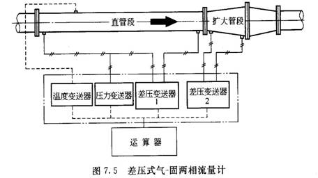 如圖7.1所示,應用組分濃度儀表、速度儀表和動(dòng)量通量?jì)x表兩兩組合可測得兩相質(zhì)量流量;應用容積流量?jì)x表和溫度、壓力儀表亦能組合測得氣-液分相流量;應用容積流量?jì)x表和密度計、導電率儀表組合也可測出含氣煤漿的固相質(zhì)量流量。
