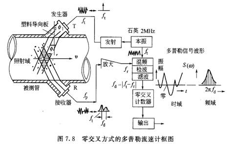 接收器接收到的散射波頻率信號fr與石英振蕩器的友射頻率信號ft經(jīng)混頻、檢波處理,并通過(guò)濾波器取出低頻成分,即可得到多普勒頻率信號。多普勒信號波形中幅值為零的零交叉信號由零交叉計數器計數,并換算成流速信號輸出顯示。