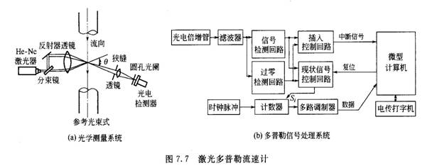 超聲波多普勒流速計的原理是向被測多相流體連續發(fā)射超聲波,通過(guò)測量?jì)上嗔黧w中顆粒、氣泡或液滴散射的超聲波多普勒頻移來(lái)確定多相流體的流速。目前己達到實(shí)用化的零交叉方式的多普勒流速計的原理框圖如圖7.8所示。