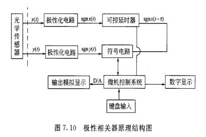 為了對傳感器獲得的流動(dòng)隨機噪聲信號進(jìn)行相關(guān)分析,尋找出相關(guān)函數極值對應的延時(shí)時(shí)間τo所采用的極性相關(guān)器原理結構如圖7.10所示。由極性化電路、可控延時(shí)電路、符號電路以及微機控制系統及其他外部電路組成。極性化電路的作用是將隨機模擬信號轉變?yōu)榫哂袃煞N幅值的脈沖信號,信號中大于零的電平全變?yōu)門(mén)TL1電平,小于或等于零的電平全變?yōu)門(mén)TL電平。實(shí)際上,其就是一個(gè)比較器?煽匮訒r(shí)電路是為完成相關(guān)函數值計算提供盡可能寬的可調延時(shí)范圍,以滿(mǎn)足工業(yè)對象流速變化范圍要求。采用RAM 2114芯片構成的延時(shí)器,最大時(shí)延有32ms、64ms和128ms三擋。符合電路的作用是求出統計時(shí)間內兩極性化函數符號相同的次數n,當兩信號符號相同時(shí)允許計數。