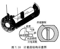 流量計量段采用一對插入管內并與流向并行的平行傳感器板(如圖7.18所示)。傳感器板上鑲嵌著(zhù)幾個(gè)電容電極,根據產(chǎn)生的電容信號通過(guò)復雜的數據計算,得出各分相流量。