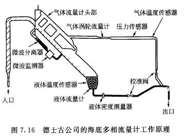 德士古公司的海底多相流量計構成如圖7.16所示。將總流量計裝在井口附近(圖中從略),以便測出混合物的總流量及其密度。然后利用其分離裝置(微波分離器)將采出物分離成氣相和液相(油水相),并分別計量氣相和液相的體積流量。采用渦輪流量計計量氣體的體積流量,專(zhuān)用流量計計量液體的體積流量。含水率則由Texaco微波含水檢測儀測定。此種含水檢測儀可精確地測定油水乳化液和油水混合液中0~100%的含水率,而無(wú)論其中哪一種組分是連續相。原子密度儀可測出液流中攜帶的氣量。最后,結合在各點(diǎn)測得的溫度、壓力數據,通過(guò)計算機得出各相分相流量。