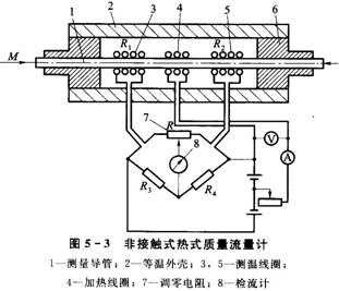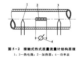 這種質(zhì)量流量計的加熱元件和測溫元件都置于被測流體的管道內,與流體直接接觸,常被稱(chēng)為托馬斯流量計,適于測量氣體的較大質(zhì)量流量。其結構原理如圖5-2所示。由于加熱及測量元件與被測流體直接接觸,因此元件易受流體腐蝕和磨損,影響儀表的測量靈敏度和使用壽命。測量高流速、有腐蝕性的流體時(shí)不宜選用,這是接觸式的缺點(diǎn)。