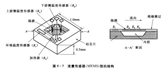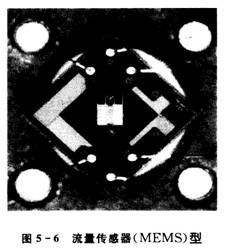 流量傳感器(MEMS)型如圖5-6所示,是采用微電子機械系統技術(shù)將加熱器和傳感器制作成傳感器芯片并封裝在半導體電路板上的流量計。