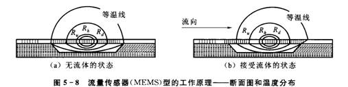 氣體流動(dòng)時(shí),上游側溫度下降,下游側溫度上升,因此Ru和Rd的溫度平衡被打破。利用Ru、Rd的溫度差的變化,可以測量流速。在傳感器芯片上,如果能測得流路的代表流速v,設流路的斷面積為S,則q=v·S,從而可以導出全流量。傳感器芯片的測量流速是不受溫度、壓力影響的質(zhì)量流速,因此這里導出的流量是質(zhì)量流量。圖5-8是流量傳感器(MEMS)型的工作原理。