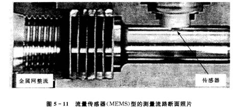 流量傳感器(MEMS)型的傳感器屬于小型傳感器,可設置于流路壁面近旁。要利用設置于壁面近旁的傳感器對流路的代表流速進(jìn)行高準確度的測量,必須將傳感器芯片配置于層流境界層內的最佳位置。同時(shí),由于是根據局部空間的流速來(lái)測量整個(gè)流量,因此在測量位置上游的整流是很重要的因素。整流時(shí)可采用金屬網(wǎng)的組合等各種方式,如圖5-11所示。