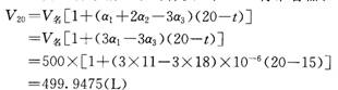 ①先將標定溫度下的容積換算成標準情況下的容積,對500L標準容器: