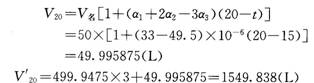 例〕設標定水流量標準裝置2000L工作量器,標定該縮頸量器采用二個(gè)標準量器,即500L和50L,其線(xiàn)膨脹系數分別為