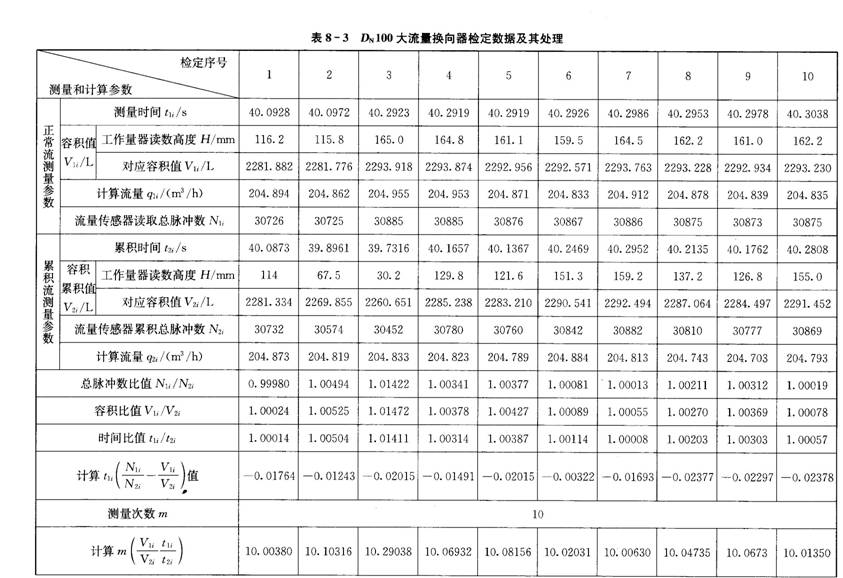 〔例〕檢定某廠(chǎng)的水流量標準裝置1#臺位,其管徑DN100mm,作最大流量時(shí)穩定度試驗,使用工作量器2000L,最大流量qvmax=250m3/h,試驗結果如表(8-8),試確定最大流量的穩定度。