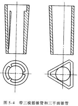 錐管的內表面除了光滑的圓錐面外,還可以做成帶導向棱筋或使用三角形截面,如圖5-4所示,這樣做的好處是不僅起到了導向桿的作用,而且使浮子的讀數位置(即最大直徑處)和錐管避面的距離很近,對透明度不高的液體介質(zhì)也可能觀(guān)察到浮子的位置。
