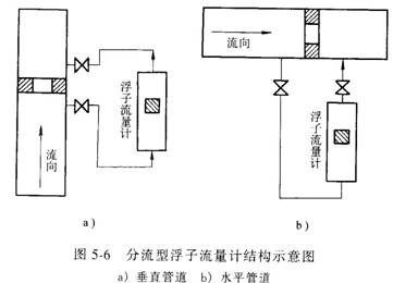 (2)分流型浮子流量計相對于全流型,只有部分被測流體流過(guò)浮子流量計。一般分流型儀表由裝在主管道上的標準孔板(或均速管)和小口徑破璃浮子流量計組合而成,應用于管徑較大,又只需就地指示的場(chǎng)所,價(jià)格低廉,如圖5-6所示。