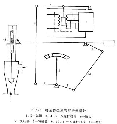 當被測流體自下而上流過(guò)錐管時(shí),浮子升起的高度通過(guò)磁鋼1、2耦合而傳給四連桿機構,經(jīng)四連桿機構9,10,11的調整,使指針12及連桿3具有與流量呈線(xiàn)性的位移,再通過(guò)第二套四連桿機構3,4,5帶動(dòng)鐵芯6相對差動(dòng)變壓器7產(chǎn)生位移,所產(chǎn)生的差動(dòng)電勢經(jīng)過(guò)轉換器8轉換成標準電流信號輸出。