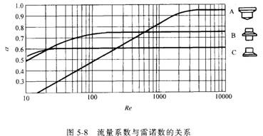 大量的實(shí)驗表明,浮子流量計的流量系數α與浮子的幾何形狀和流動(dòng)雷諾數Re有關(guān)。對于一定的浮子形狀,當雷諾數大于某一界限雷諾數ReK后,流量系數α將趨于一常數。所以,對于一定形狀的浮子和一定的流體,若實(shí)際雷諾數在界限雷諾數以上,就能使得體積流量qv和浮子高度h之間基本成線(xiàn)性關(guān)系,上述各種浮子流量計的刻度換算公式可以使用。當實(shí)際雷諾數比界限雷諾數小時(shí),流量系數α將隨雷諾數變化,使用時(shí)不能忽略由于α變化帶來(lái)的影響。圖5-8為幾種典型浮子的流量系數曲線(xiàn)。