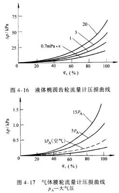 與其他流量計相比,容積式流量計的壓力損失是比較大的,尤其是在測量高粘度流體時(shí)。它跟流量的關(guān)系并非線(xiàn)性,一般呈二次曲線(xiàn)的規律變化,如圖4-16和圖4-17所示,它們分別表示液體和氣體容積式流量計的壓力損失曲線(xiàn)。