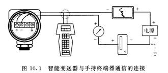 手持終端器或智能現場(chǎng)通信器是以微處理器為基礎的與智能變送器進(jìn)行數字通信的接口裝置,是一種新型調試工具,利用它能在現場(chǎng)(或控制室)對智能變送器進(jìn)行組態(tài)、測試、調整、校驗、查看自診斷信息。圖10.1所示為與苦持終端器的連接,F在多家儀表公司都有此類(lèi)產(chǎn)品,用戶(hù)對變送器進(jìn)行維修、校驗極為方便。