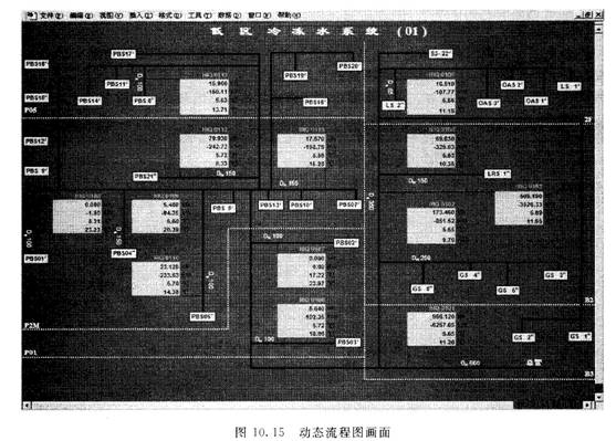 ②動(dòng)態(tài)流程圖畫(huà)面。從該幅畫(huà)面可看出各檢測控制點(diǎn)在流程中的位置及與流程之間的關(guān)系。每個(gè)檢測控制點(diǎn)有一個(gè)數據顯示窗口,顯示代表該點(diǎn)主要特征的動(dòng)態(tài)數據,數據還可以設置超限報警,用閃動(dòng)的紅色表示超限,以引起操作者注意。