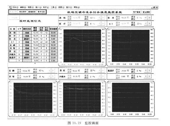 ⑩監控畫(huà)面。監控畫(huà)面是操作人員經(jīng)遠程終端對被控參數進(jìn)行控制的界面。畫(huà)面中顯示被控參數的當前測量值、給定值、歷史曲線(xiàn),調節閥當前閥位、閥位給定值、閥位曲線(xiàn)以及位式閥和泵的開(kāi)關(guān)狀態(tài)等,典型畫(huà)面如圖10.19所示。